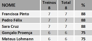 No mês de março, o destaque vai para três atletas: Francisca Pinto, Pedro Félix e Sara Cruz, que faltaram apenas a 1 dos 8 treinos realizados.